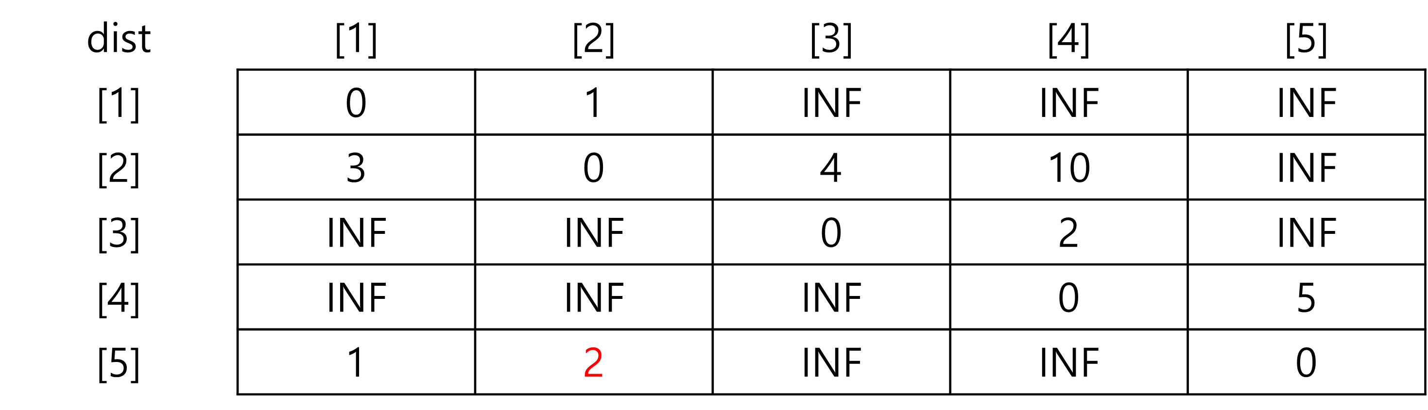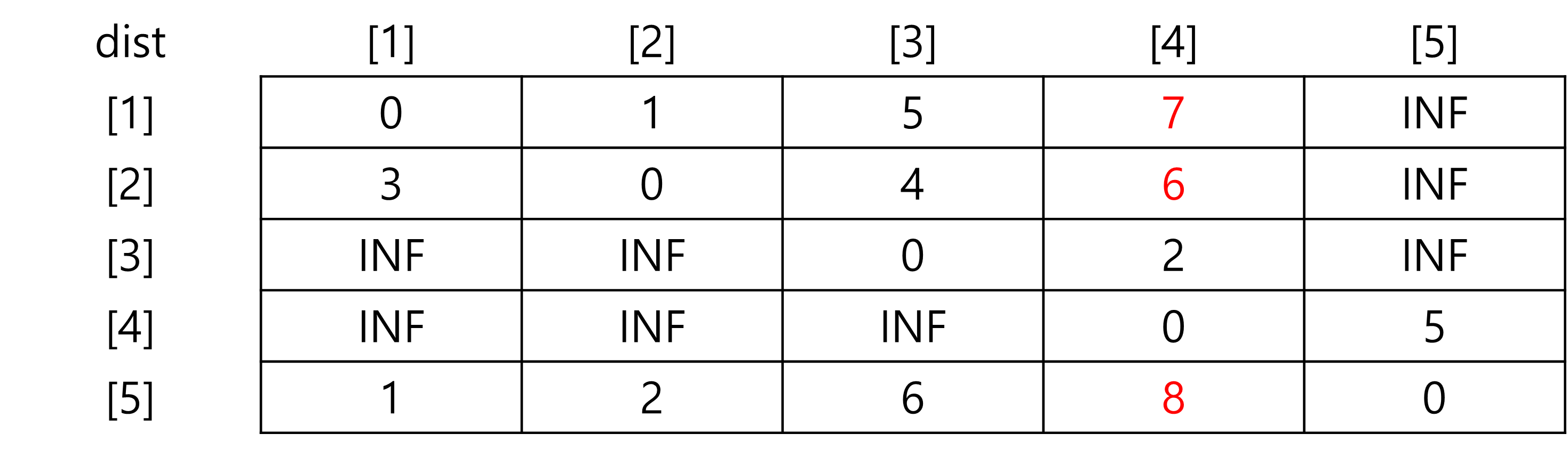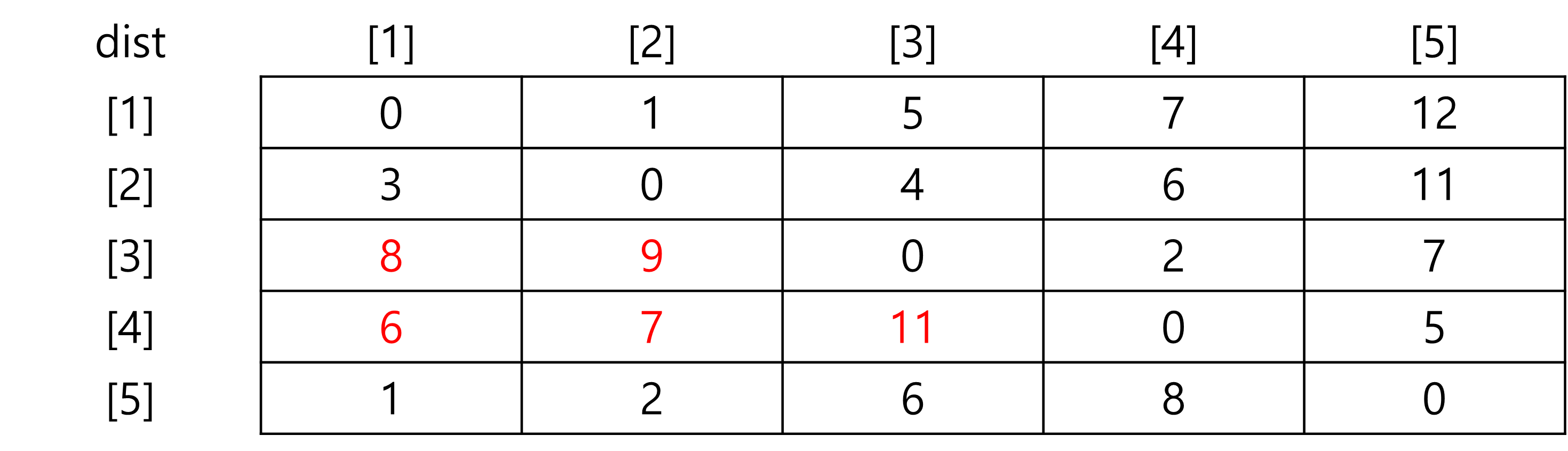 두 정점사이의 거리를 나타내는 dist 배열을 나타내보자.