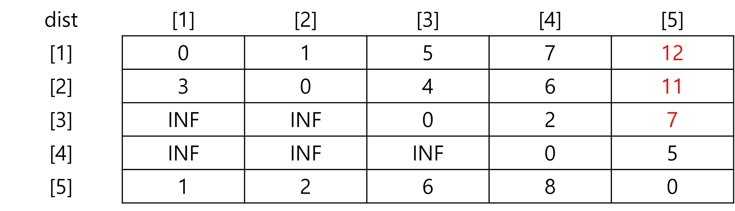 dist[1][5]=min(dist[1][5],dist[1][4]+dist[4][5])=min(INF,7+5)=12