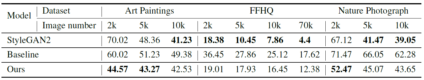 Metric은 합성된 이미지의 의미적인 현실감을 측정하기 위해 FID를 사용했습니다. 데이터의 수가 1000개 미만인 경우, generator는 5000개의 이미지를 생성하고, 생성된 이미지와 전체 학습 데이터와의 FID를 측정했습니다. LPIPS는 두 이미지간의 perceptual distance를 나타내는데 본 논문에서는 실제 이미지가 주어졌을때 generator에 latent space back-tracking을 수행할 때 reconstruction quality를 측정할 때와 auto-encoding의 성능을 측정할 때 사용되었습니다.