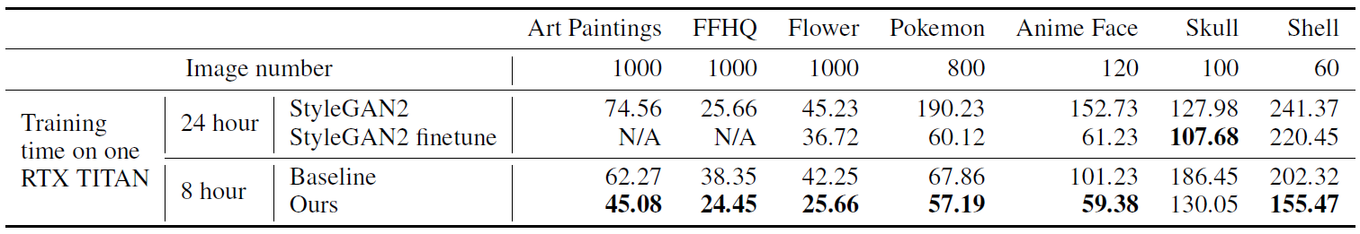 위 사진은 qualitative result입니다. StyleGAN2의 경우 학습시간이 오래 걸리면서도 mode collapse가 발생한 것을 알 수 있습니다. 그러나 본 논문의 방법은 만족스러운 이미지를 지속적으로 생성하고 있습니다. 주목할만한 점은 Flower, Shell. Pokemon을 학습시키는데는 단 3시간밖에 걸리지 않았다는 것입니다.