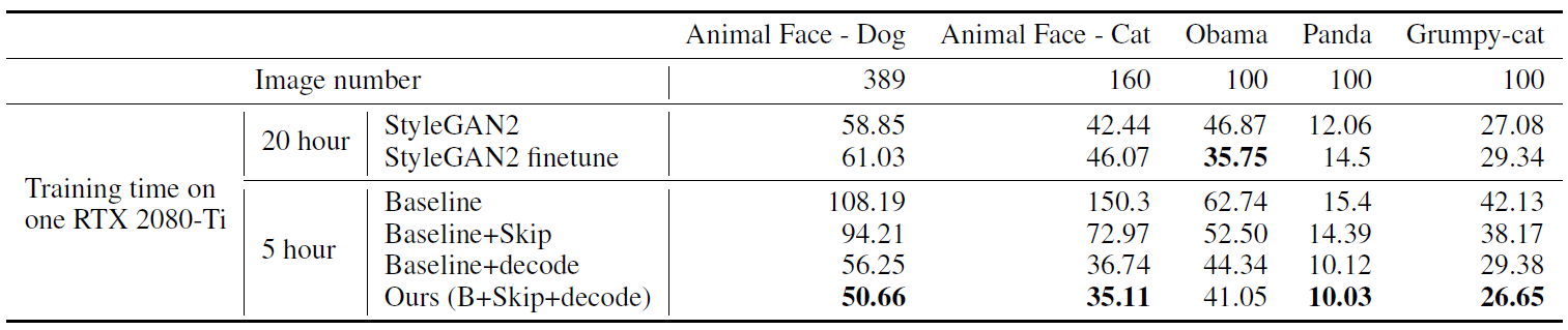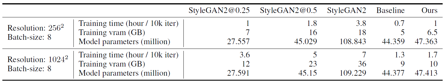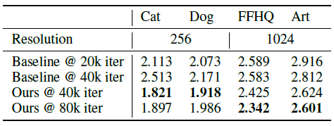 이번에는 1024x1024 해상도에서 더 충분한 데이터를 가지고 실험해보았는데 이때는 온전한 StyleGAN2를 Art와 Photograph에서는 batch size 16과 두개의 TITAN RTX로 5일 가량 학습시켰고 FFHQ에 대해서는 Zhao et al.의 pretrained model을 사용했습니다. 그러나 본 논문의 모델은 batch size 8으로 하나의 2080-Ti로 24시간 밖에 걸리지 않았습니다. 본 논문의 모델을 7만장의 FFHQ에서는 32의 batch size를 사용했습니다. 그 결과 StyleGAN2의 성능이 매우 우수하게 나왔지만 연산량과 데이터의 크기 측면에서 본 논문의 방법도 충분히 견줄만 하다고 합니다.