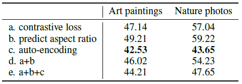 그 결과 다른 두 방법(a,b) 각각과 둘을 합친것, 본 논문의 방법과 함께 사용한것(a,b,c)보다 본 논문에서 사용된 auto-encoding이 가장 좋은 성능을 냈습니다.
