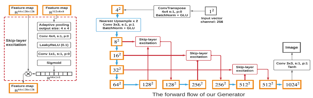 본 논문에서는 skip-connection에 두 가지 아이디어를 덧붙여 Skip-Layer Excitation (SLE)을 고안했습니다. 첫 번째로, 기존의 ResBlock은 서로 다른 conv layer의 channel 간의 addition으로 구현되어 두 conv layer의 channel이 동일해야 했지만, SLE는 channel-wise multiplication을 적용하여 연산량을 크게 줄였습니다. 두 번째로, 기존의 GAN 모델들은 skip-connection은 같은 해상도 끼리만 이루어졌습니다. 그러나 SLE는 같은 spatial-dimension이 더이상 필요하지 않기 때문에 다양한 해상도 범위 (8x8과 128x128, 16x16과 256x256, 32x32와 256x256)에서 이루어지게 하였습니다. 수식으로 표현하면 아래와 같습니다.
