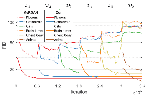 MeRGAN은 iteration이 진행됨에 따라 FID가 증가하는걸로 보아 forgetting이 발생했지만, GAN memory는 forgetting이 발생하지 않았습니다.
