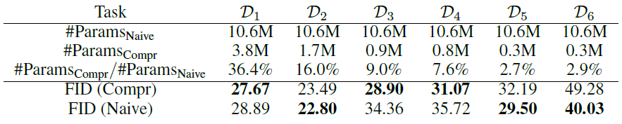 4.3절에서 서술한 parameter compression의 효과를 알아보기 위해 6개의 나비 카테고리로 구성된 task sequence를 설정했습니다. 실험 결과는 아래와 같습니다.