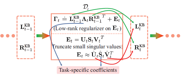 여기서 \(L^{KB}_{t-1}, R^{KB}_{t-1}\)는 각각 이전 task의 left/right knowledge base이고, \(\Lambda_t=Diag(\lambda_t)\)이고 \(\lambda_t\)와 \(E_t\)는 각각 task-specific한 trainable parameters입니다. Nuclear norm \(\Vert{E_t}\Vert_*\)는 loss function에 low-rank property를 유지하기 위해 더해집니다. t번째 task에 대한 학습이 끝나고, \(E_t\)에 대해 SVD (Singular Value Decomposition)을 적용하여 상위 X%만큼의 특이값을 보존하여 압축을 합니다. 그리고 각각의 left/right singluar vector를 left/right knowledge base를 업데이트하는 데 사용하여 \(L^{KB}_{t}, R^{KB}_{t}\)를 얻습니다. 전체적인 과정은 아래와 같습니다.