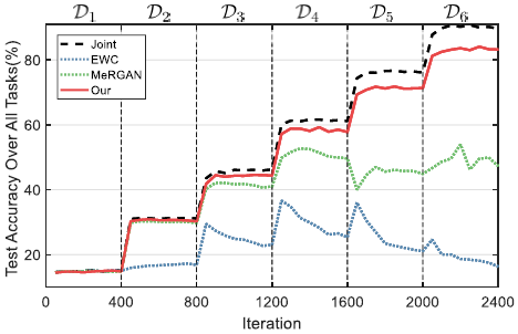 여기서 joint는 upper-bound로, 생성된 historical 데이터가 아닌, 실제 historical 데이터와 현재 task의 데이터를 함께 사용한 것입니다. GAN memory는 upper-bound에 근접한 성능을 보여주었습니다.