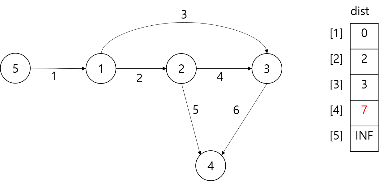 위 그림에서 dist 배열은 시작점에 해당하는 1번 정점으로부터의 거리를 나타낸다.