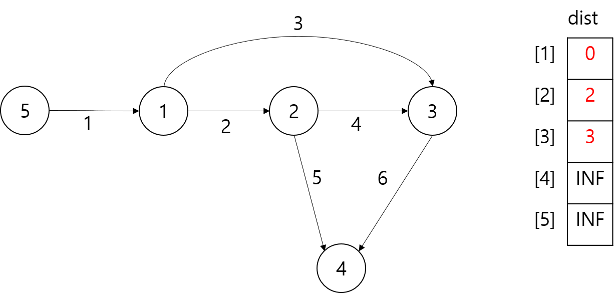 위 과정에서 dist[2]와 dist[3]의 갱신이 이루어졌다.