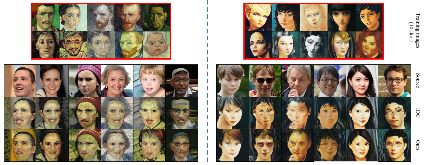 본 논문에서는 few-shot image generation을 다루고 있습니다. Few-shot image generation을 다룬 최근의 논문인 Ojha et al. 의 논문(IDC)에서 크게 두 가지의 문제점을 지적합니다. 첫번째는 identity degradation으로 source domain에서에 비해 target domain으로 전이되었을 때 identity가 떨어진다는 점입니다. 두번째는 unnatural distortion으로 현재 target domain에 잘 적응하지 못했을 때 발생합니다. 이는 IDC가 각각의 이미지의 고유한 구조를 보장하지 못해 target domain space의 sample들에 대해 drift 가 발생하기 때문입니다.